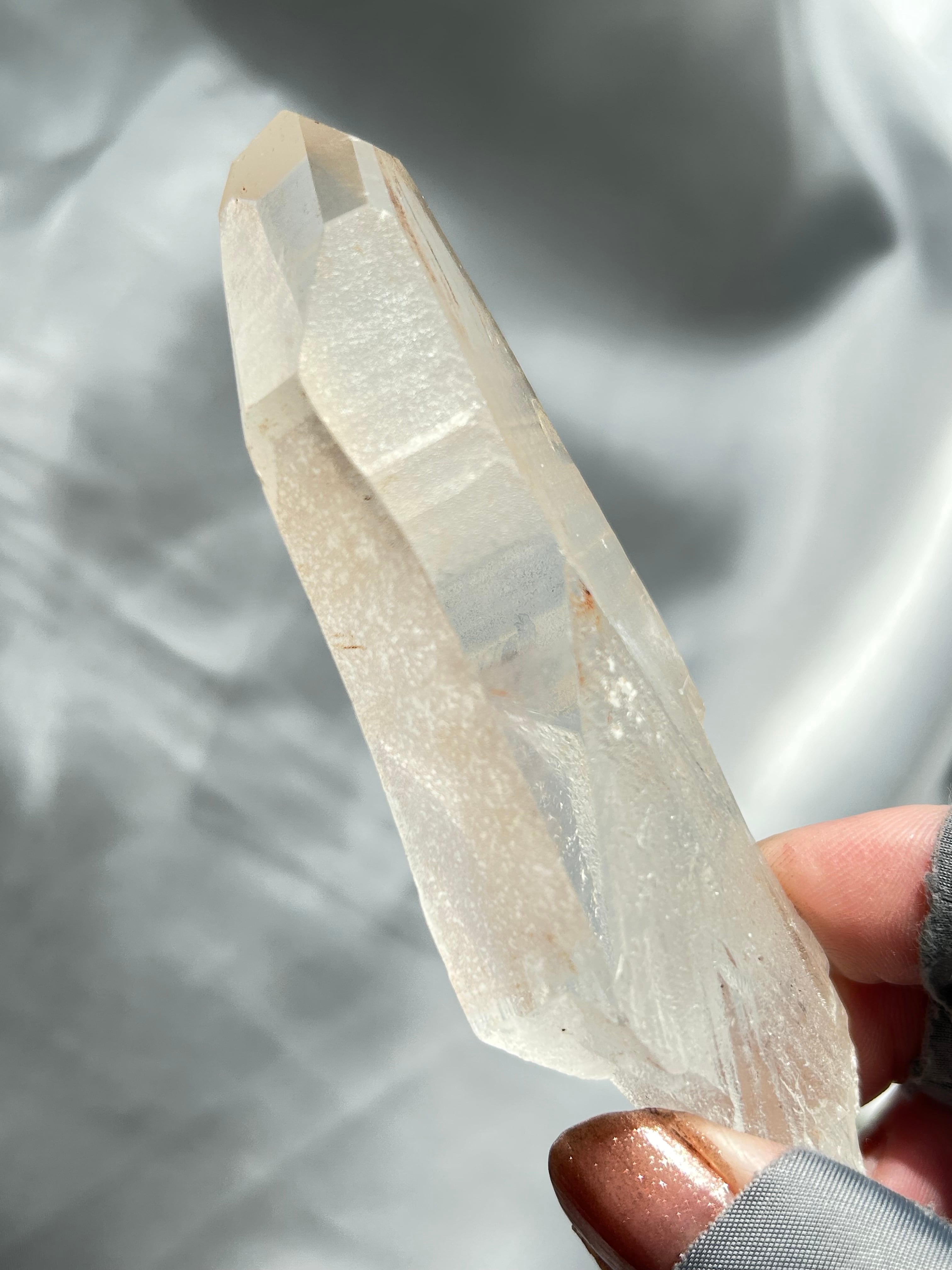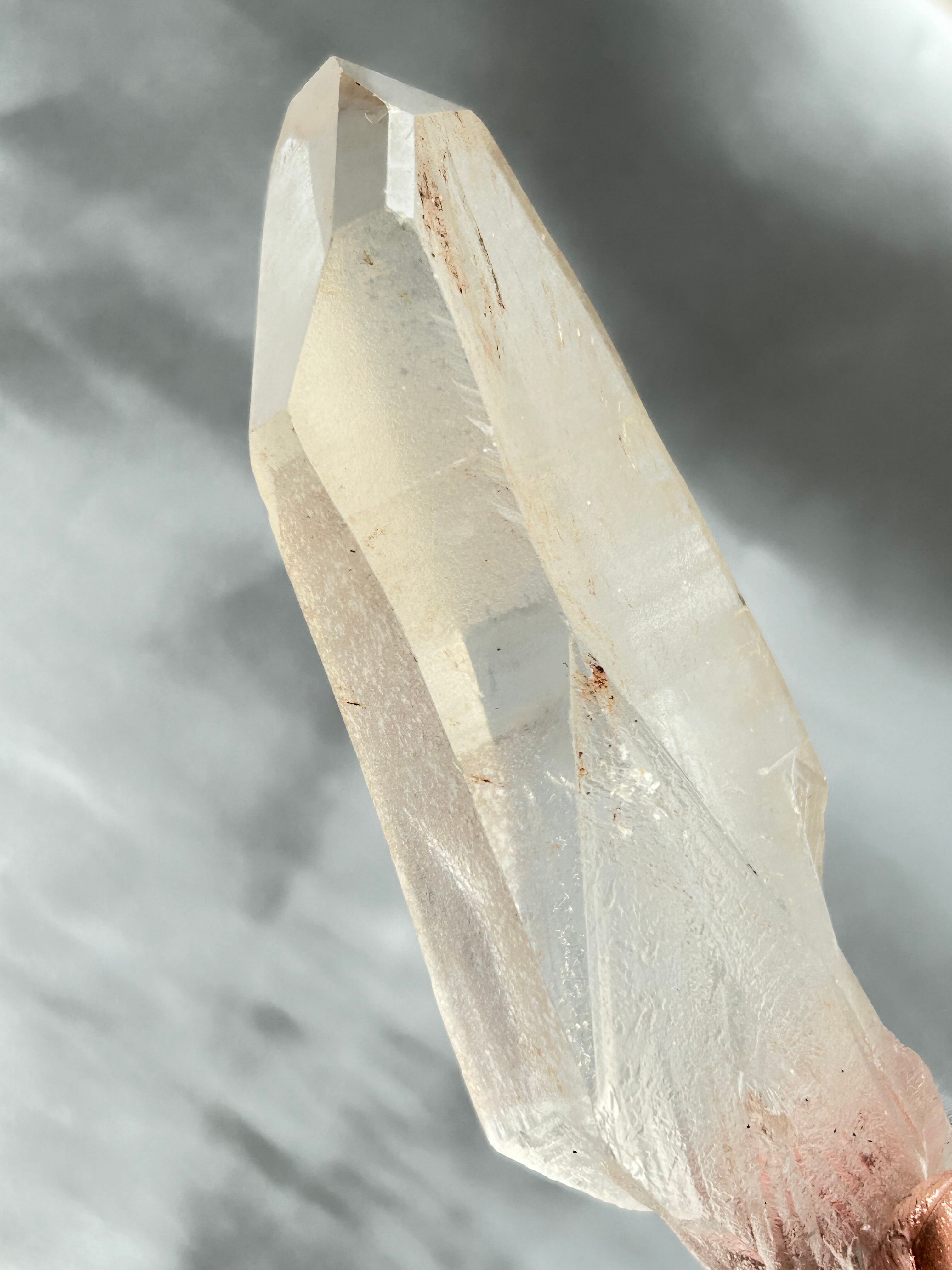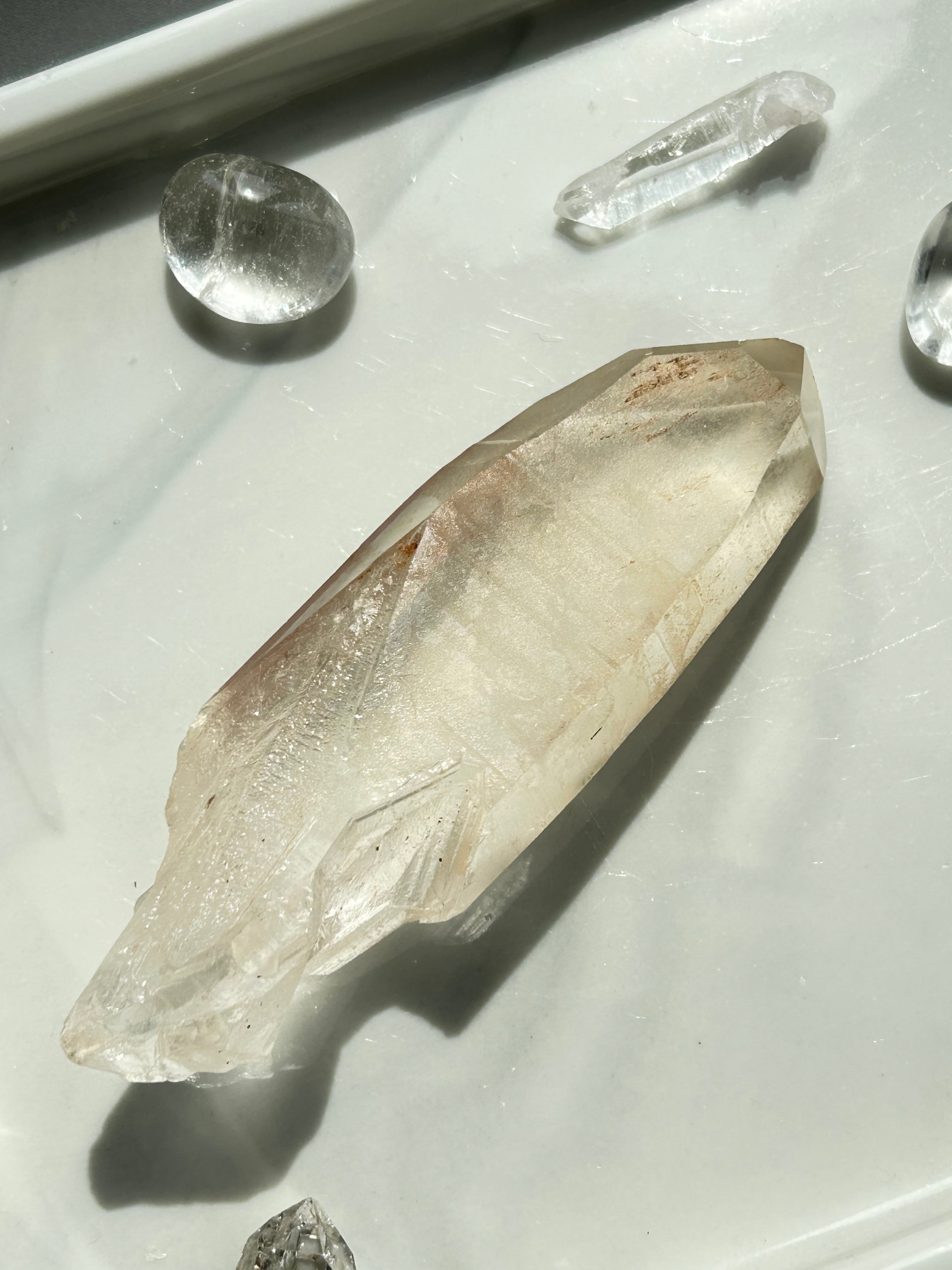 側面には複数のレコードキーパーと独自の表面グリフがあります。透明感があり、温かみのある色合いのレムリアンクォーツ。ただただ美しい!