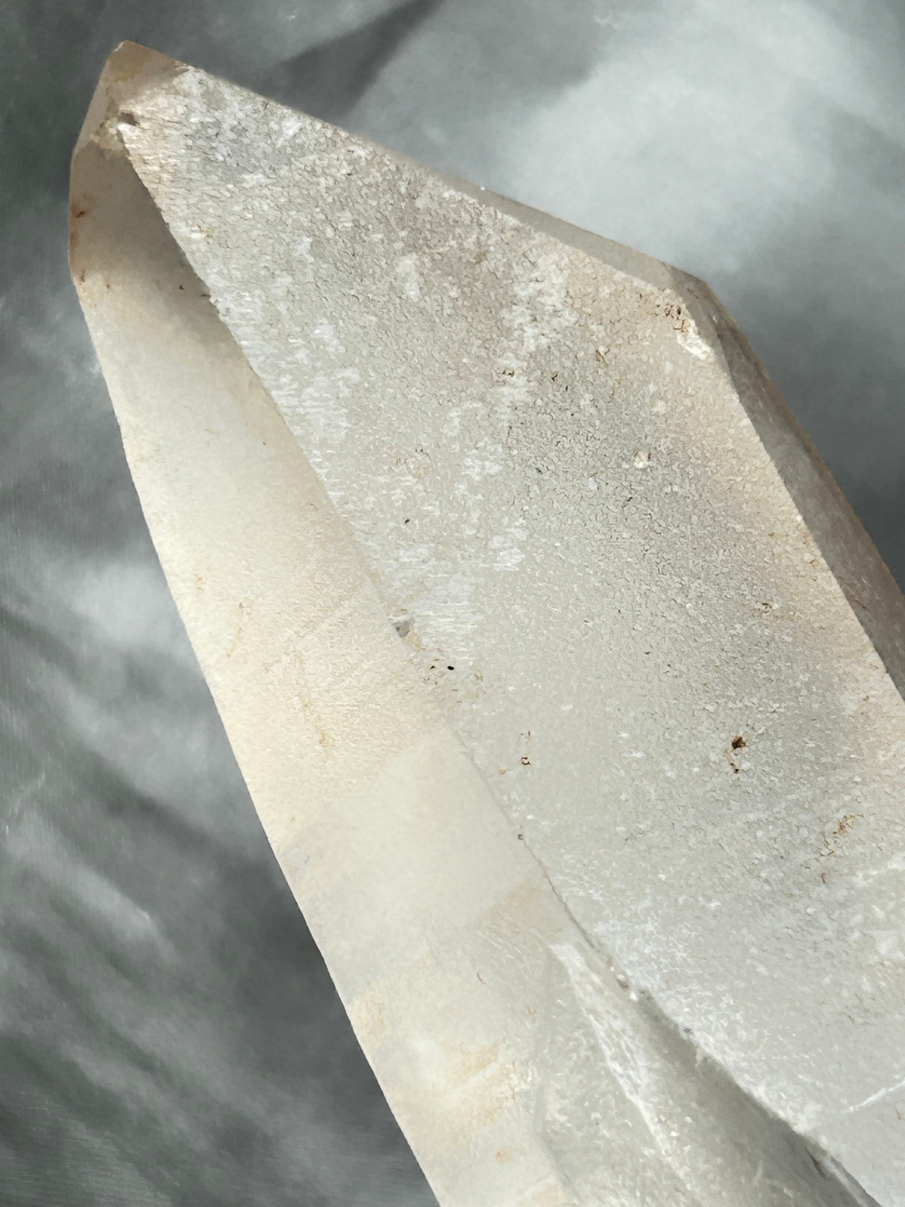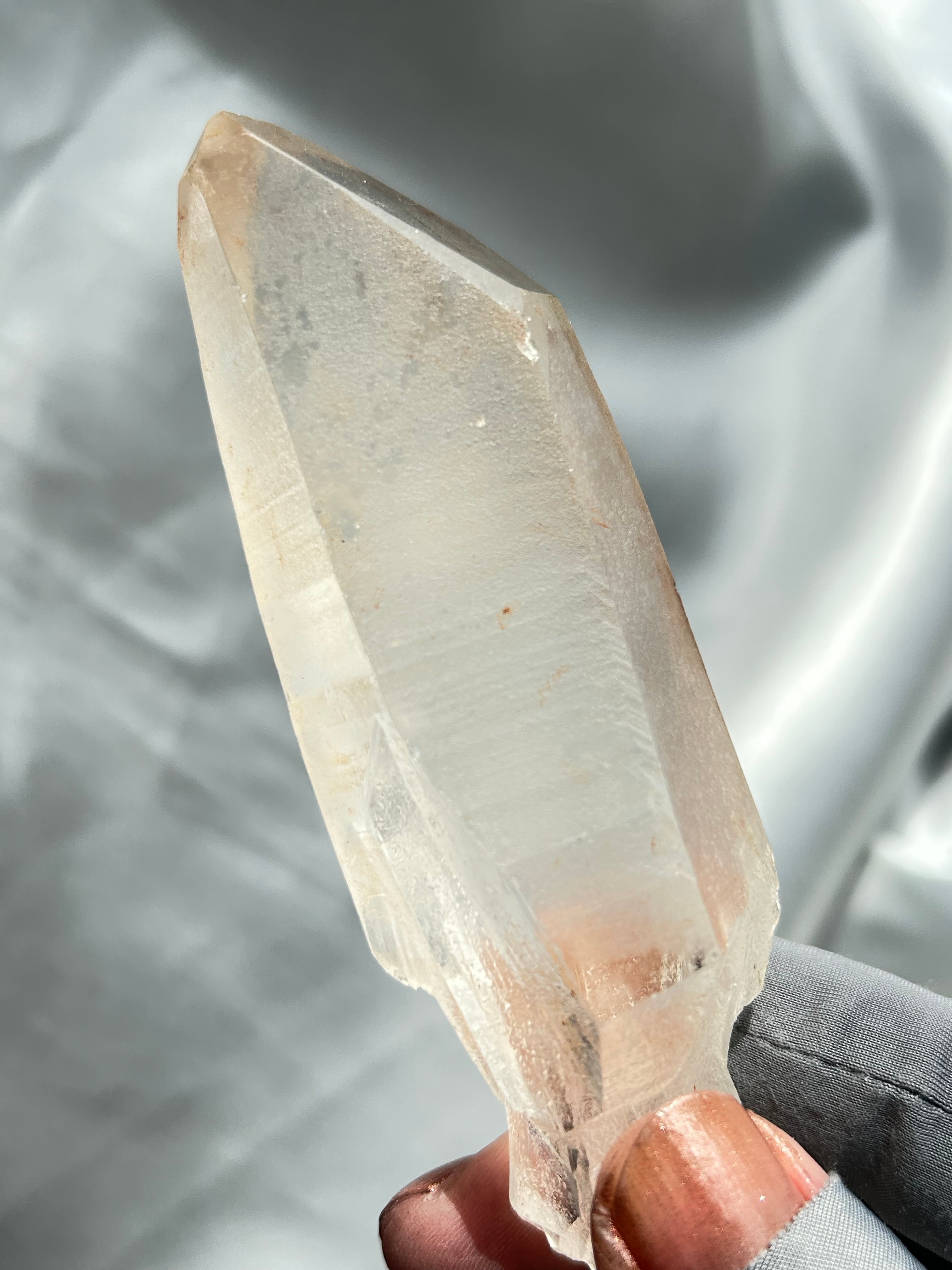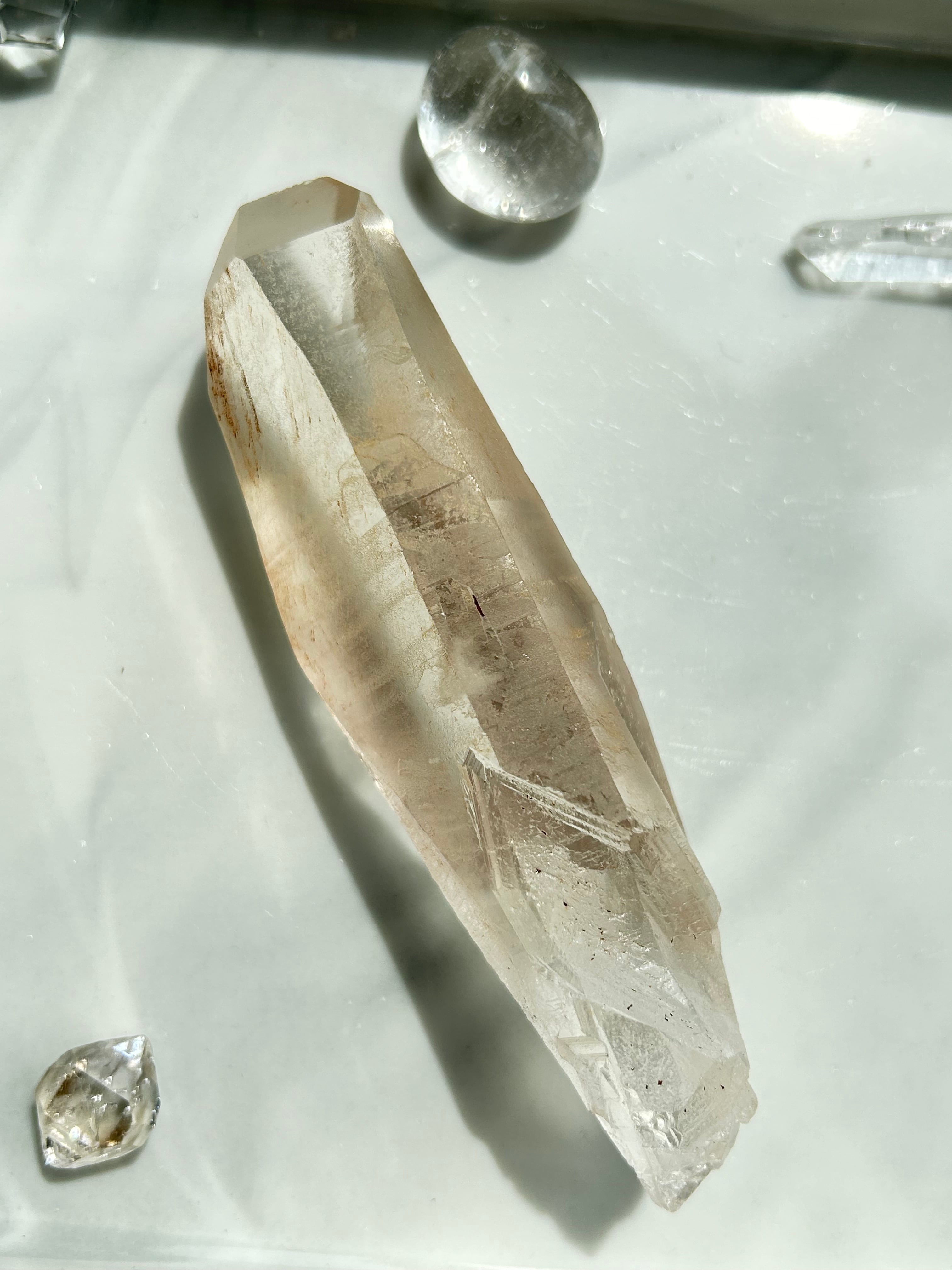 側面には複数のレコードキーパーと独自の表面グリフがあります。透明感があり、温かみのある色合いのレムリアンクォーツ。ただただ美しい!